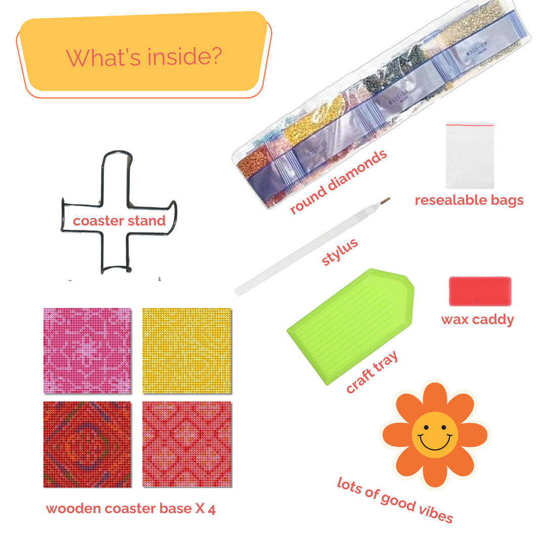 Our kit includes everything you need, including: wooden coaster base with a beautiful design and adhesive, round diamonds, stylus, craft tray, wax caddy, resealable bags and a wire coaster stand.