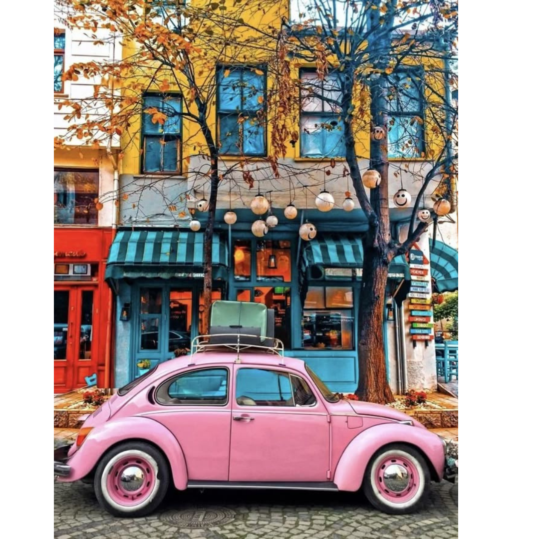 Retro wheels, candy pink feels. This street cafe scene is a postcard-worthy pause-perfect for travel lovers, nostalgia chasers, and anyone dreaming of their next escape to a European town.