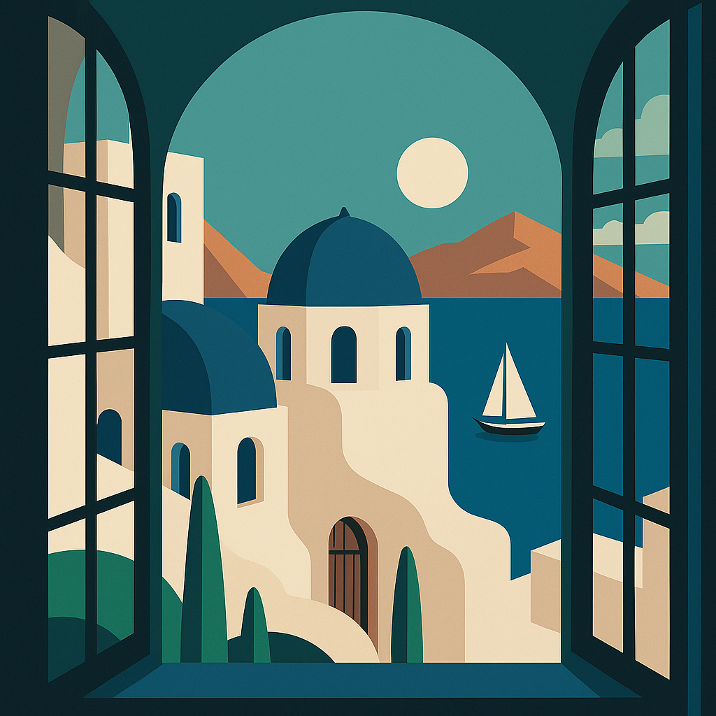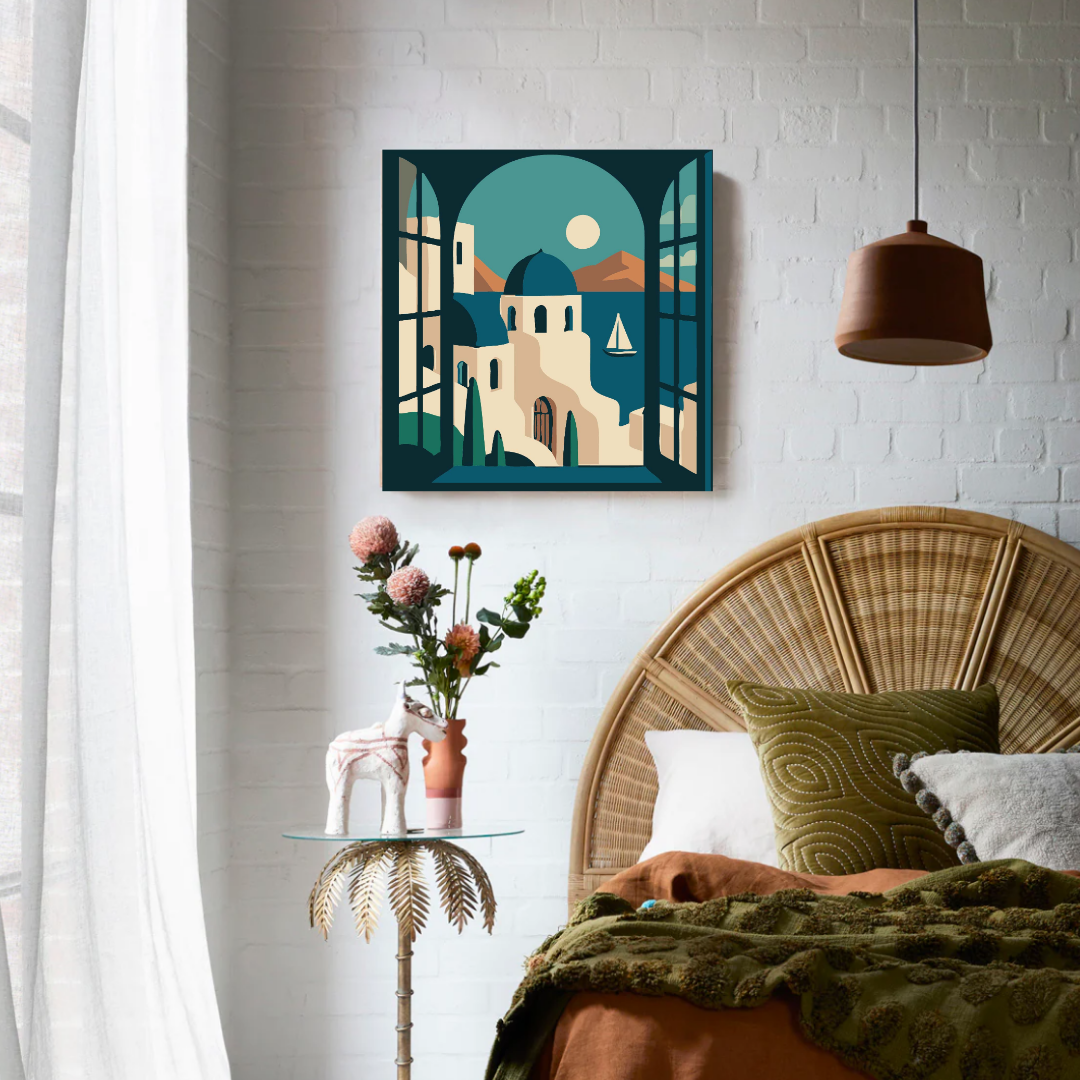 Dreaming of whitewashed walls, blue domes and salty sea breeze? View from My Room - is your paint by number escape to the Santorini islands. Its like a postcard you paint yourself.